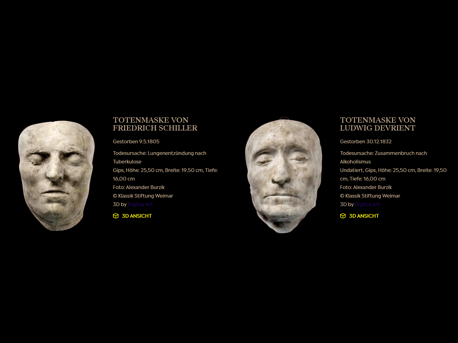Für diese Ausstellung haben wir verschiedene Exponate aufwändig digitalisiert und für die Ausstellung im Internet aufbereitet. Zu sehen sind mehrere Echtzeit-3D-Darstellungen verschiedener Totenmasken (u.a. F. Nietzsche, F. Liszt, R. Wagner, F. Schiller) sowie ein 360°-Panorama eines außergewöhnlichen Miniatur-Schaubergwerkes in einer Flasche.