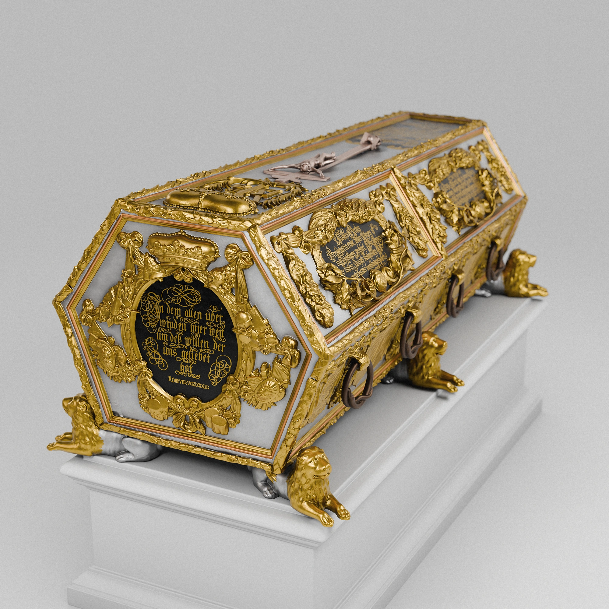Schwarz, matt, schwer – so wirkt der Prunksarg heute. Doch einst glänzte das Zinn hell, das Rosé-Silber schimmerte, Gold und Kupfer leuchteten im Kontrast. Unsere virtuelle Rekonstruktion zeigt, wie der barocke Sarg des Herzogs Johann Wilhelm von Sachsen-Jena wirklich ausgesehen hat.