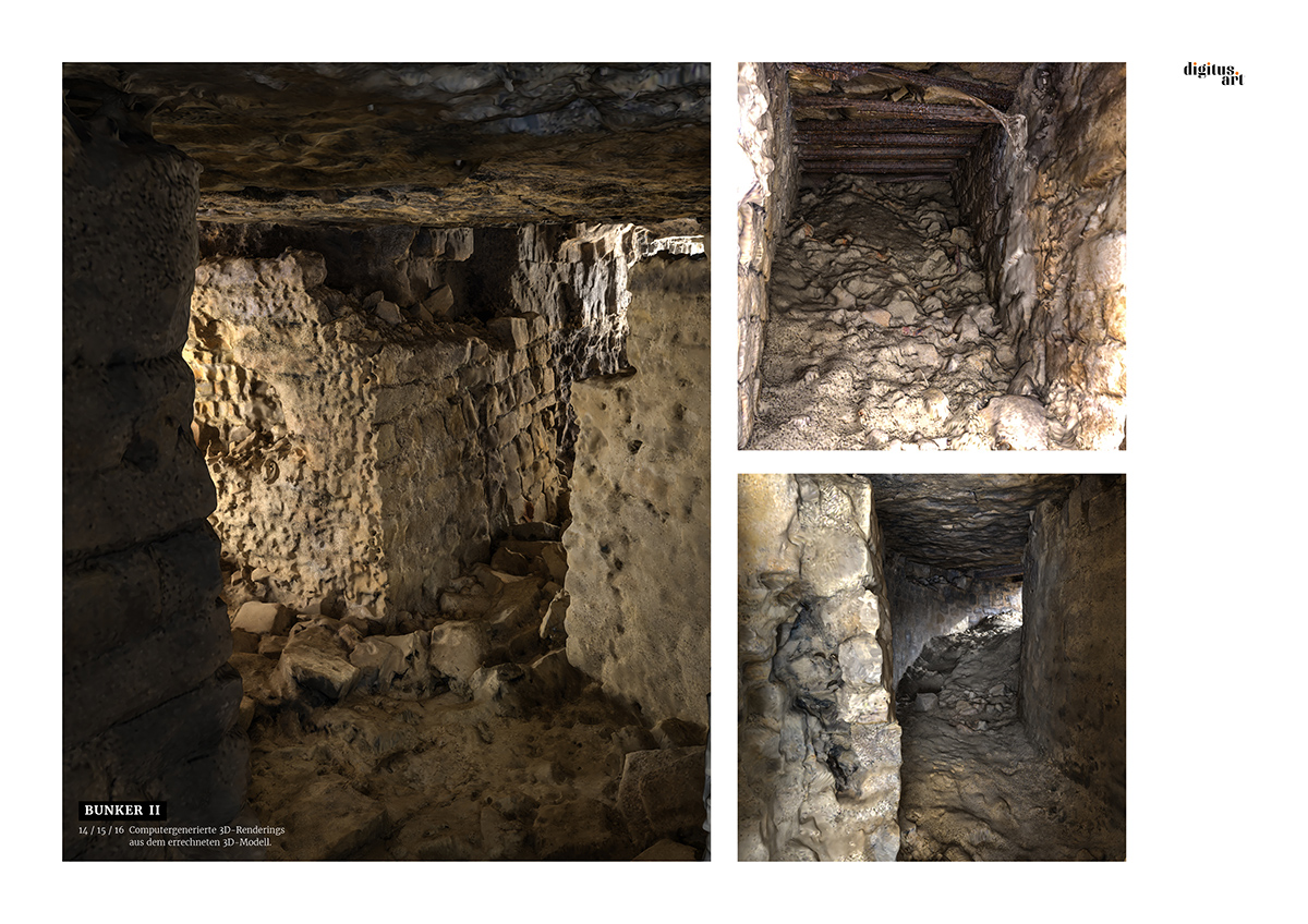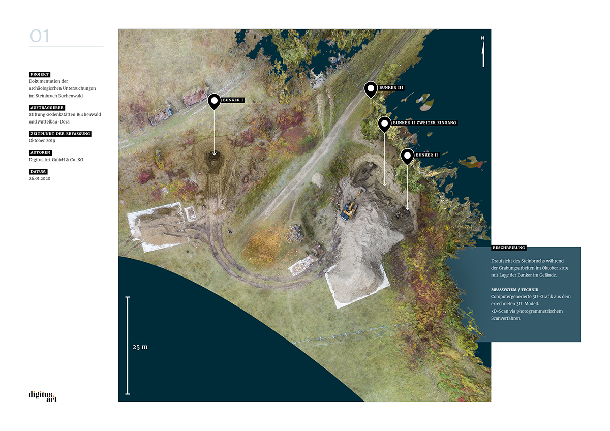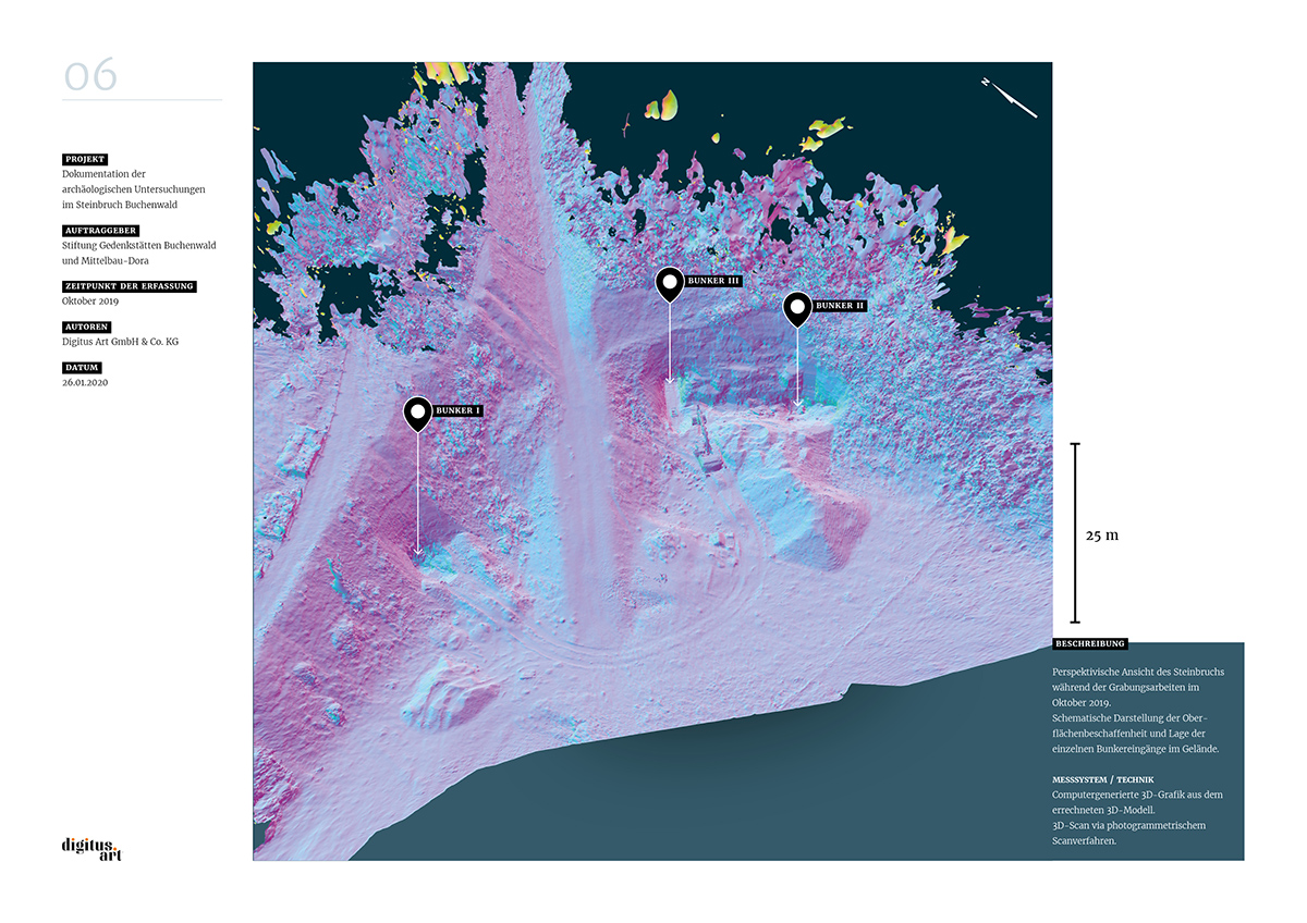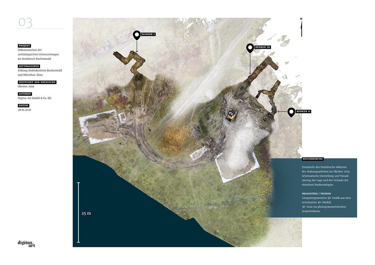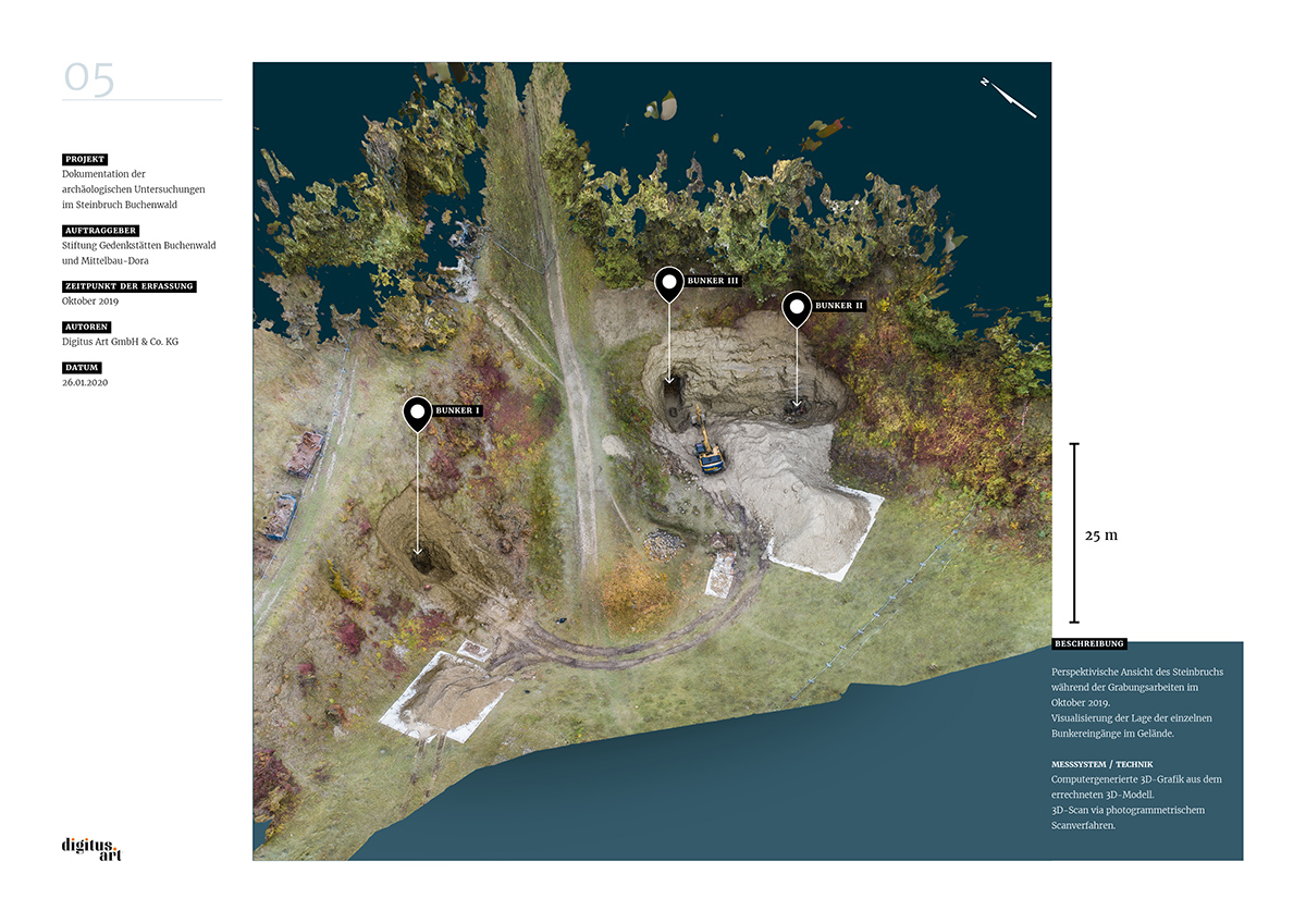 Während der Grabung, die weitere Erkenntnisse über bauliche Anlagen des NS-Konzentrationslagers Buchenwald zum Ergebnis hatte, dokumentierte digitus.art den Zustand des Steinbruches und der gefundenen Bunker. Aus den dabei im Steinbruch entstandenen Drohnenflügen und den Aufnahmen der drei Innenräume konnte nun in aufwändigen Rechenprozessen ein fotorealistisches 3D-Modell entwickelt werden.
