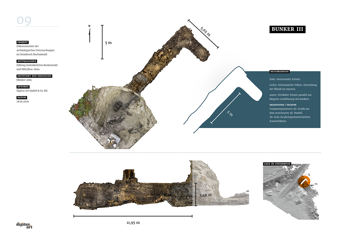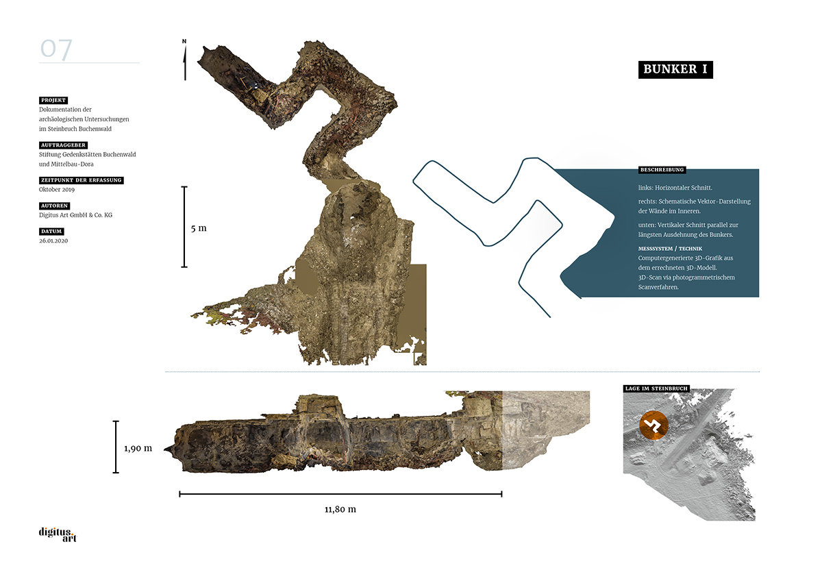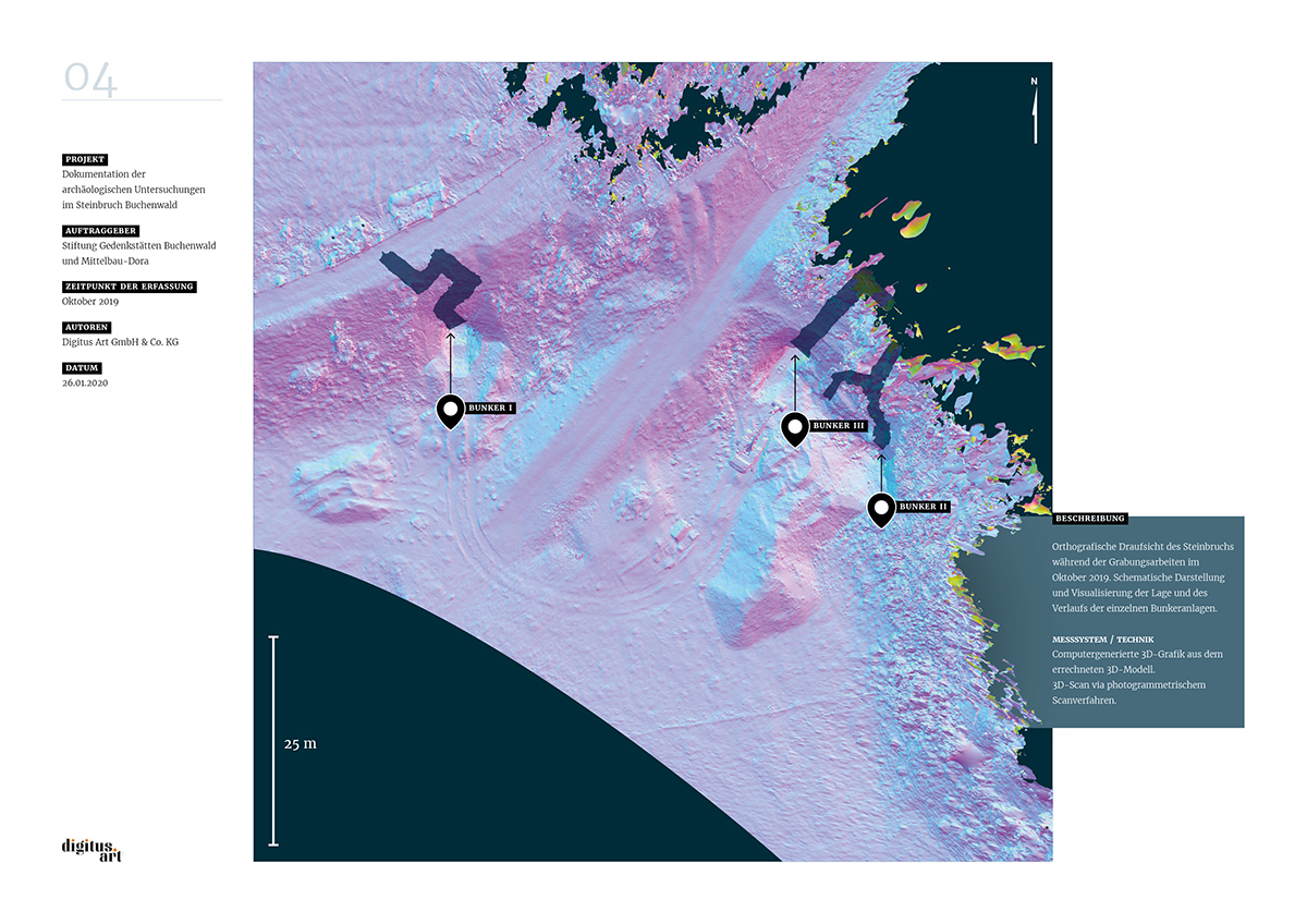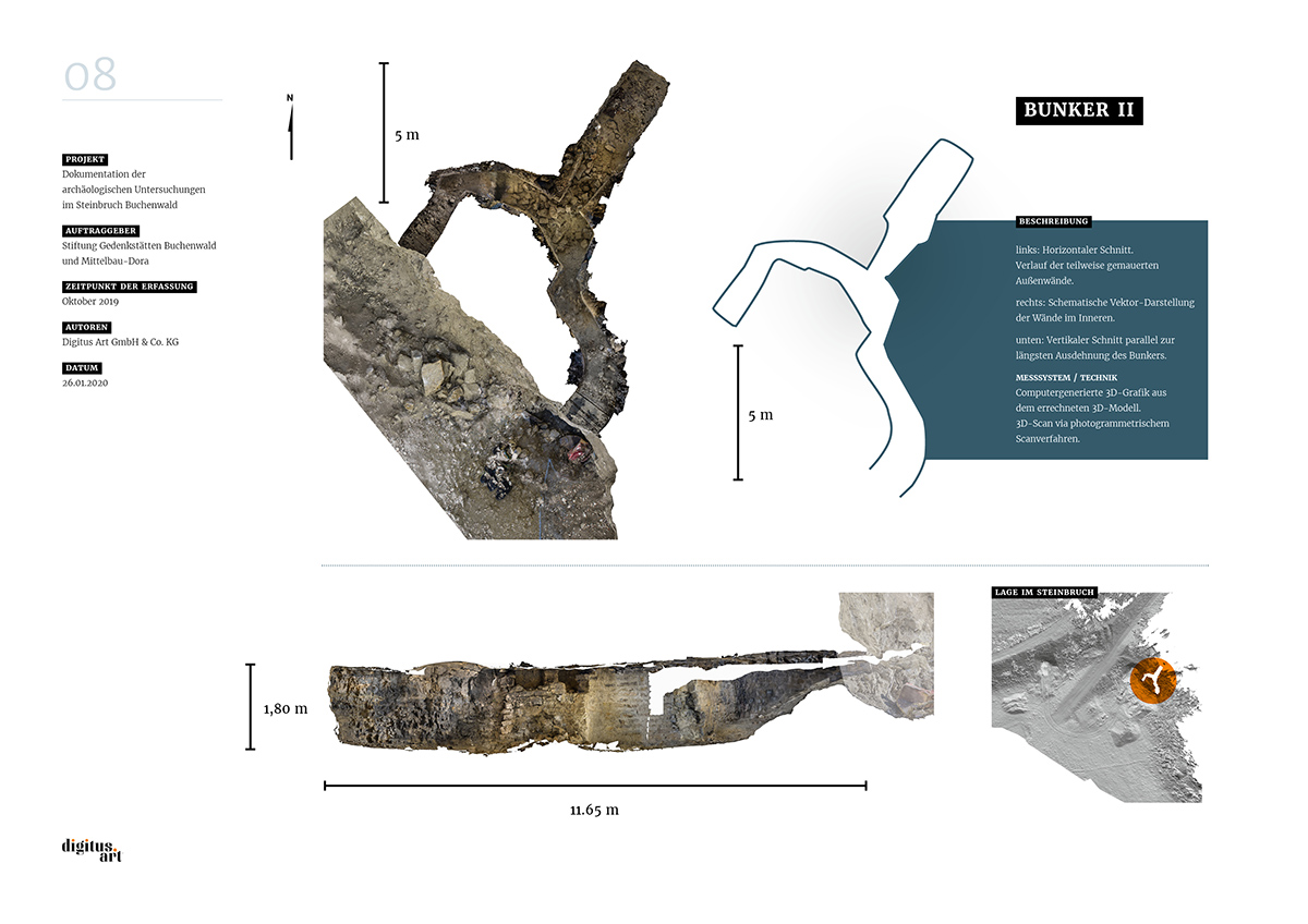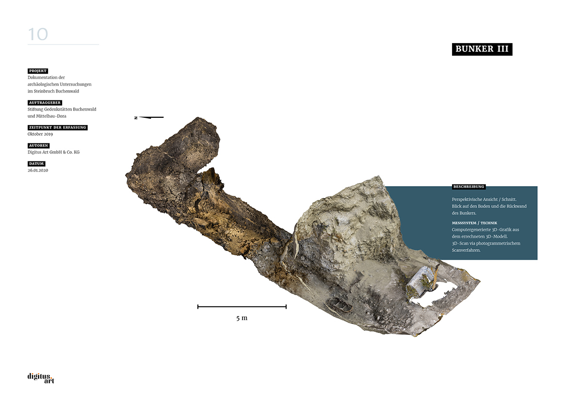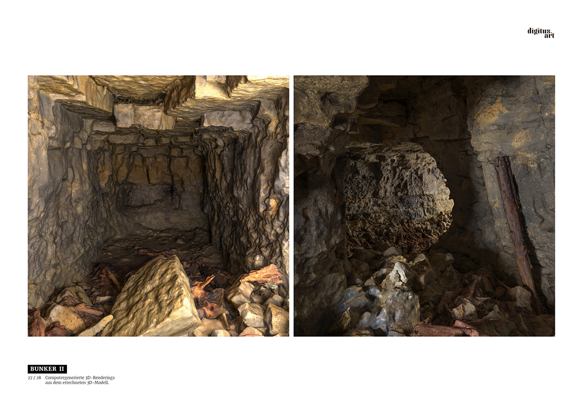 Während der Grabung, die weitere Erkenntnisse über bauliche Anlagen des NS-Konzentrationslagers Buchenwald zum Ergebnis hatte, dokumentierte digitus.art den Zustand des Steinbruches und der gefundenen Bunker. Aus den dabei im Steinbruch entstandenen Drohnenflügen und den Aufnahmen der drei Innenräume konnte nun in aufwändigen Rechenprozessen ein fotorealistisches 3D-Modell entwickelt werden.