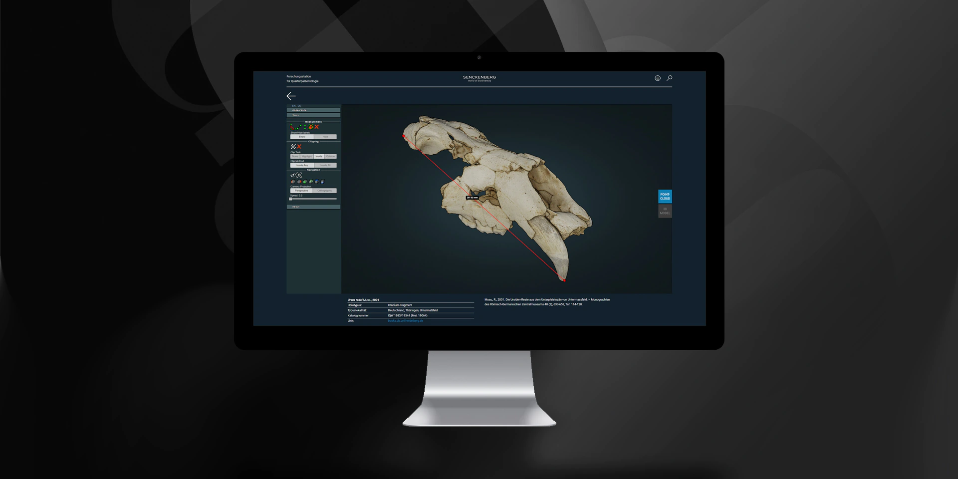 Aktuell können rund 120 hochqualitative 3D-Digitalisate des Typusmaterials sowohl in Form von dichten Punktwolken (Pointcloud) als auch als texturierte 3D-Meshes (WebGL) vielfältig genutzt werden. Mittels diverser Werkzeuge ist es dabei möglich, die interaktiven Objekte aus allen Perspektiven zu betrachten und um definierte Achsen rotieren zu lassen. Auch die Vergrößerung beliebiger Oberflächendetails wird ermöglicht, ebenso eine äußerst präzise Vermessung von individuell definierbaren Messstrecken im dreidimensionalen Raum.