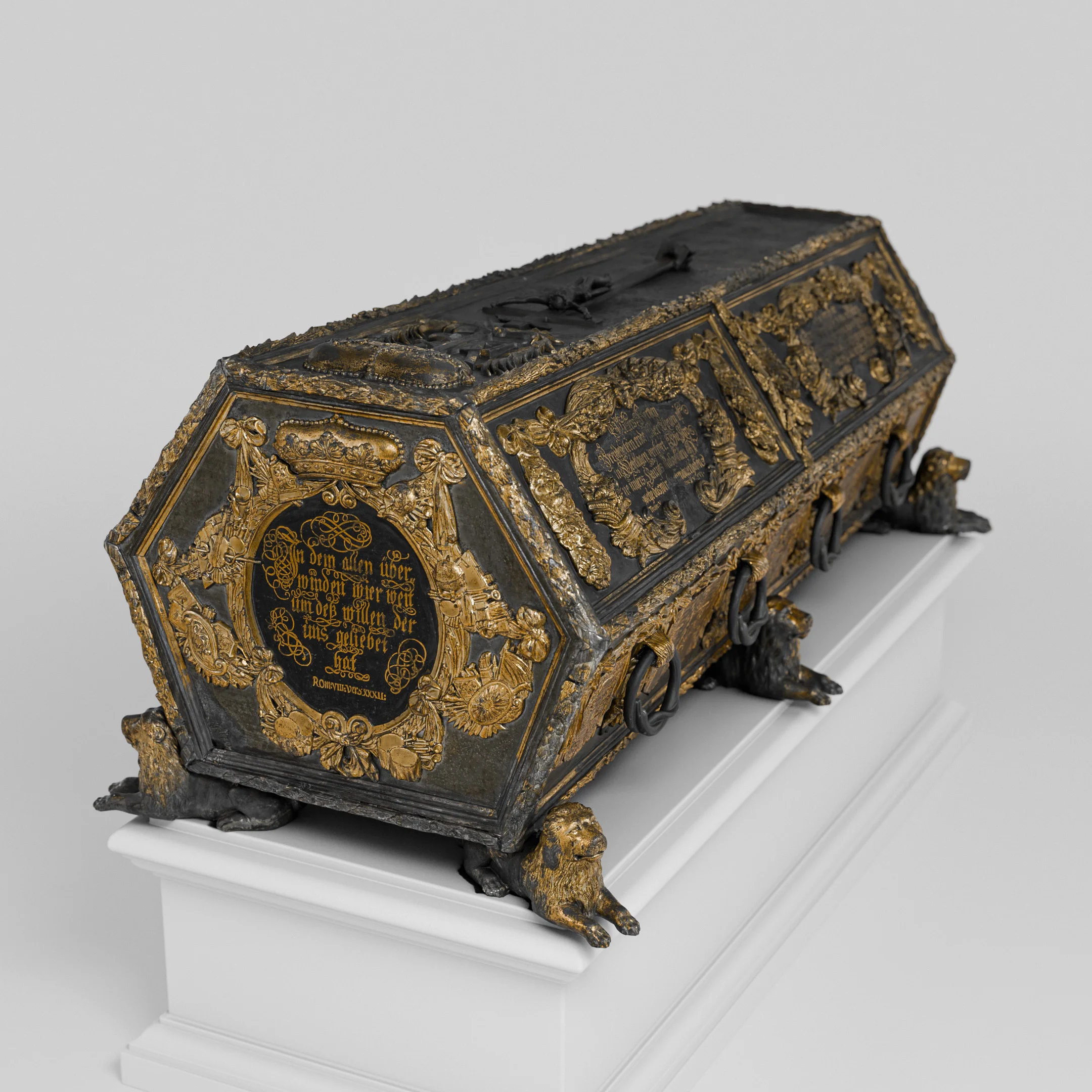 Schwarz, matt, schwer – so wirkt der Prunksarg heute. Doch einst glänzte das Zinn hell, das Rosé-Silber schimmerte, Gold und Kupfer leuchteten im Kontrast. Unsere virtuelle Rekonstruktion zeigt, wie der barocke Sarg des Herzogs Johann Wilhelm von Sachsen-Jena wirklich ausgesehen hat.